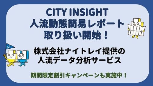 CITY INSIGHT 「人流動態簡易レポート」取り扱い開始! 株式会社ナイトレイの提供するCITY INSIGHT 人流動態簡易レポートの取り扱いを開始しました! CITY INSIGHT とは? 本製品は株式会社ナイトレイ独自の人流データを分析・結果をレポートとしてご提供す…